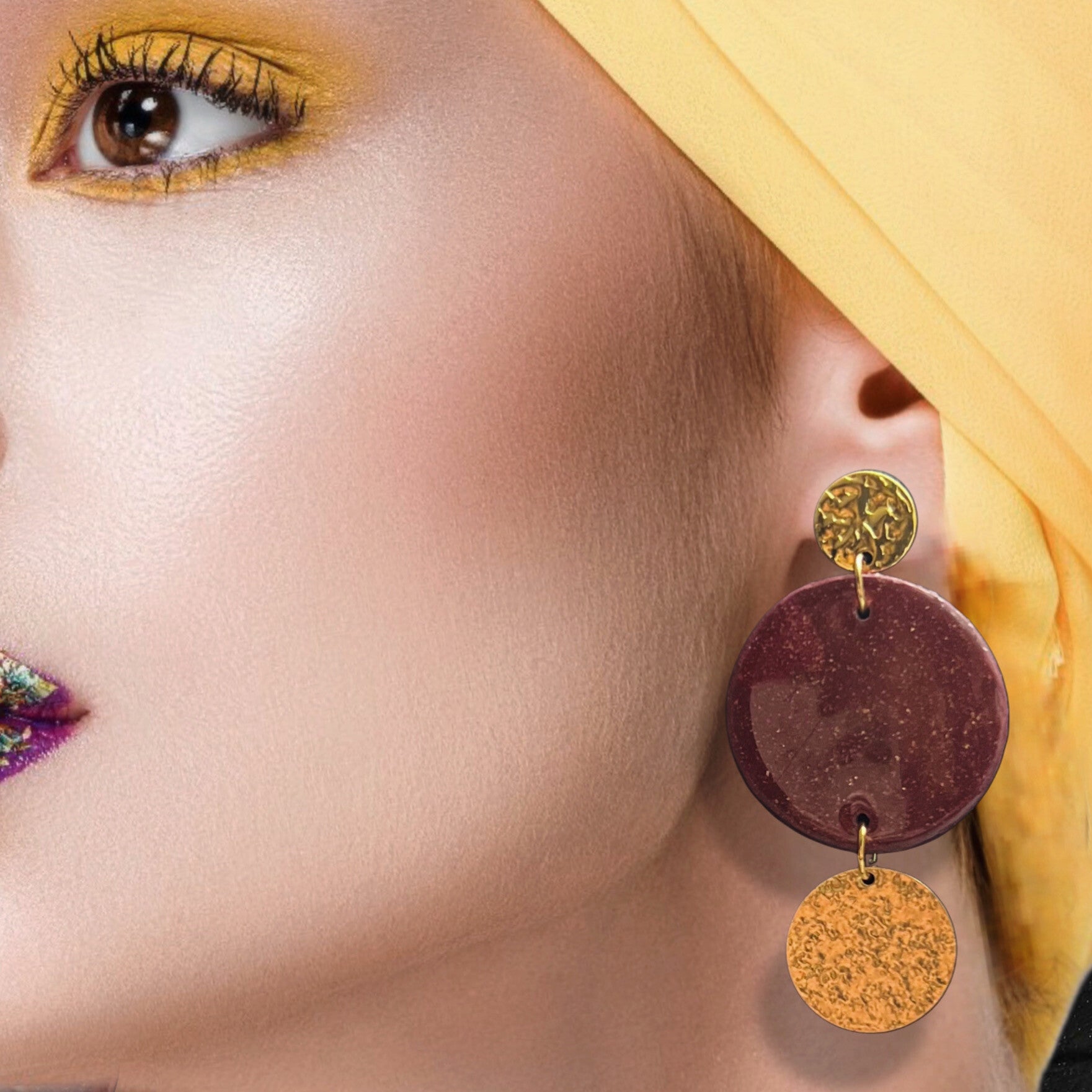 Rond bordeaux met zachte glitter Ø 3 cm. Rvs goudkleurige accessoire en oorsteker. Geen exemplaar is identiek dus bijzonder en uniek!