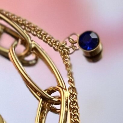 Dubbele armband met een klein kruisje in het midden. Daarnaast transparant steentjes en donkerblauw steentje. Het donkerblauwe steentje is vervangbaar voor een andere kleur.