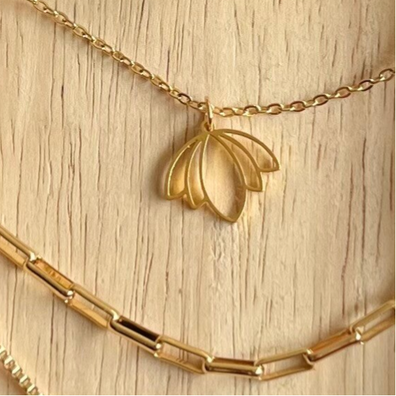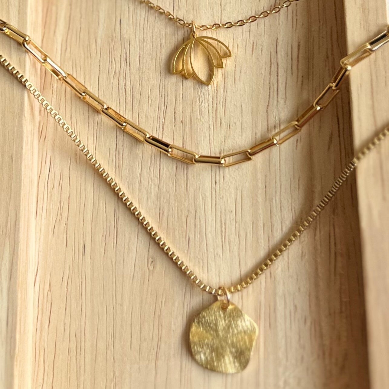 3-delige ketting met lotus en geborsteld hangertje. Langste ketting Ø 49 cm.