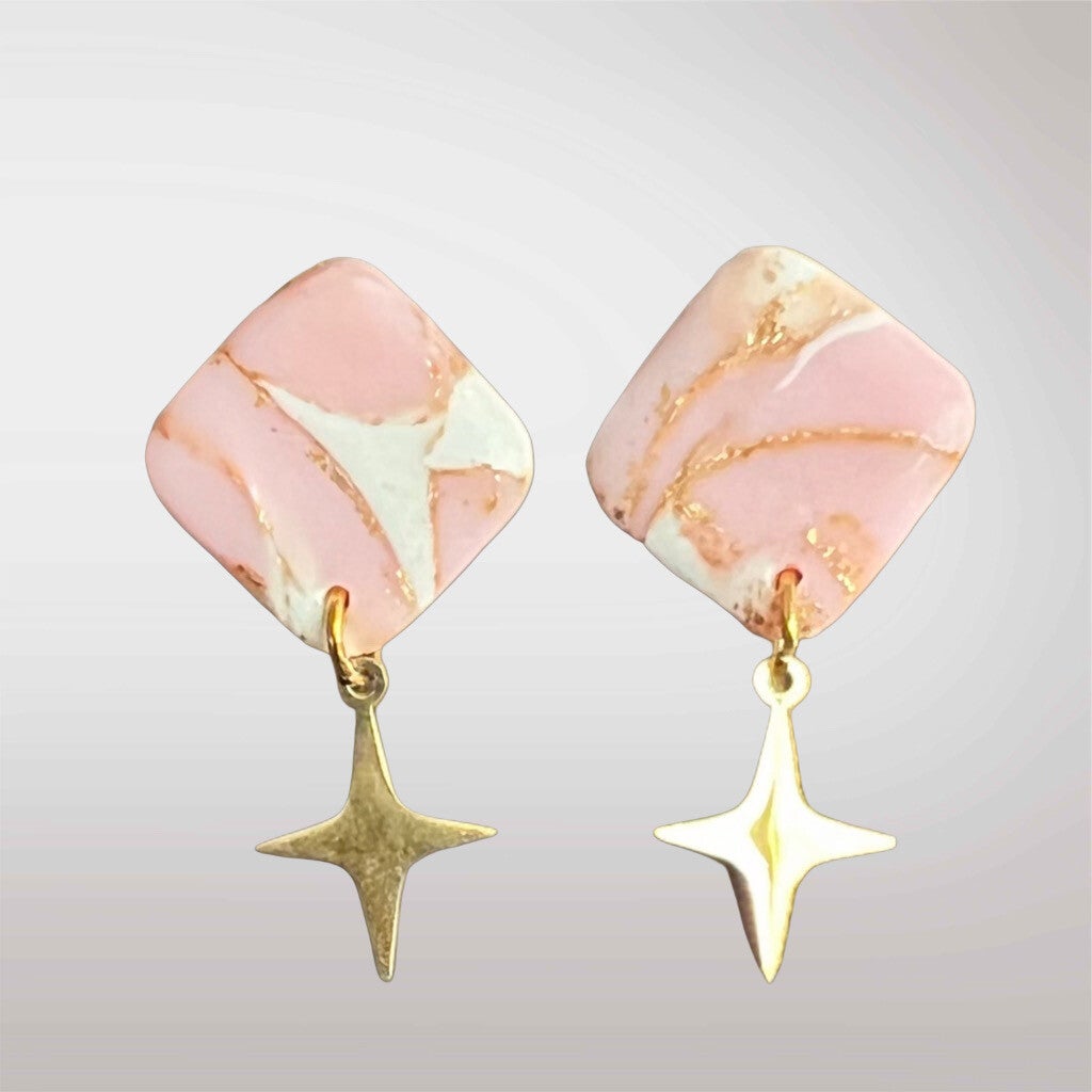 Marmerlook zacht roze, hanger goud met ster. Totale lengte is 3,5 cm.