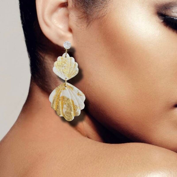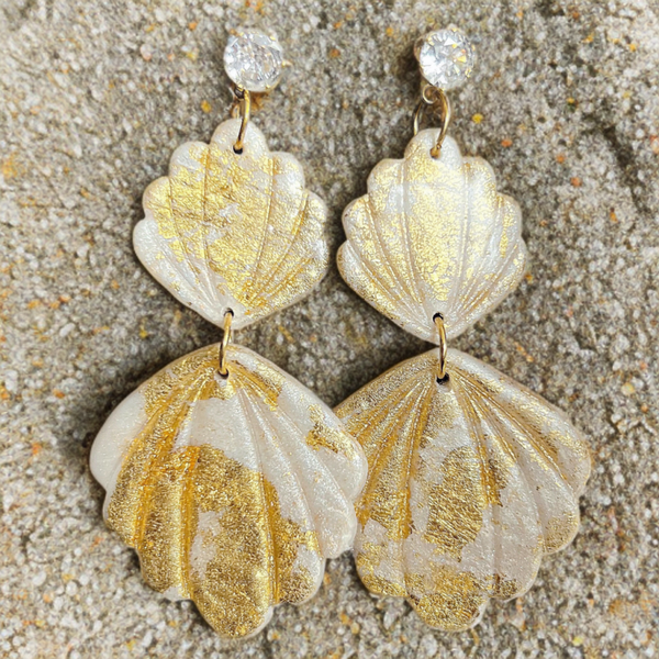 Uniek. Dubbele schelp van parel en bladgoud. Lichtgewicht. Totale lengte is 7 cm.