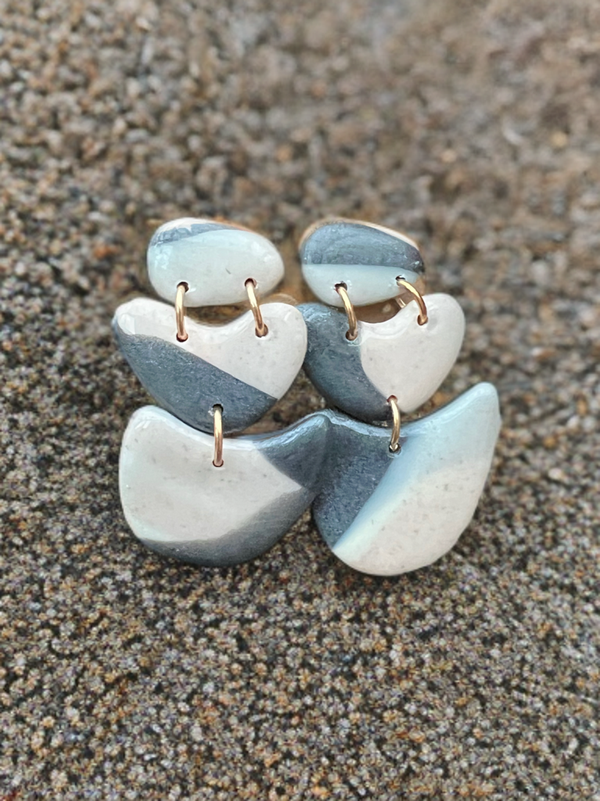 Stenen met marmerlook. Half open ronde steker. Totale lengte is 5 cm.