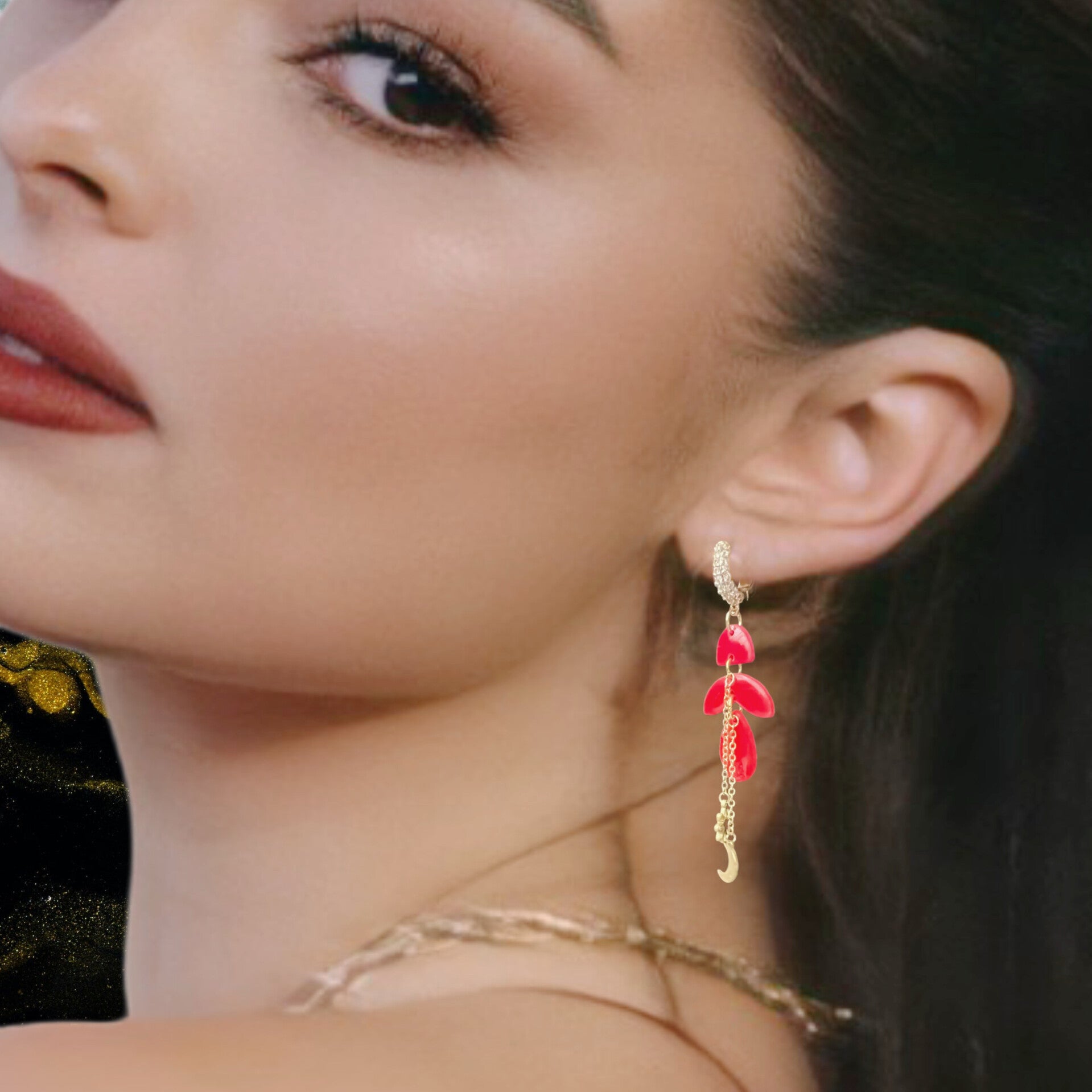 Oorsteker met rondom Zirkonia's. Lichtgewicht! 3-delig rode oorbellen met 2 kettinkjes en accesoires maan & bloem. Totale lengte 8 cm.