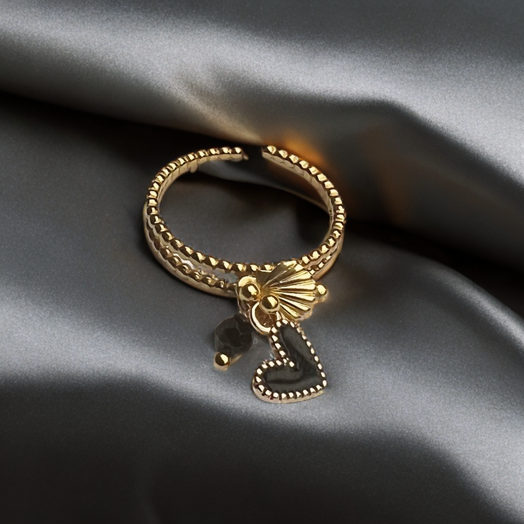 Smalle verstelbare dubbele RVS bolletjesring met bedels. Bedels bestaan uit schelpje, zwart hartje, zwarte natuursteen en gouden kraal. Breedte ring is 0,4 cm.
